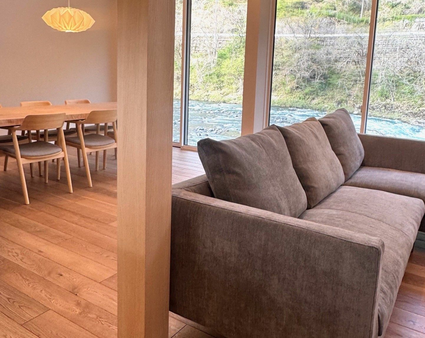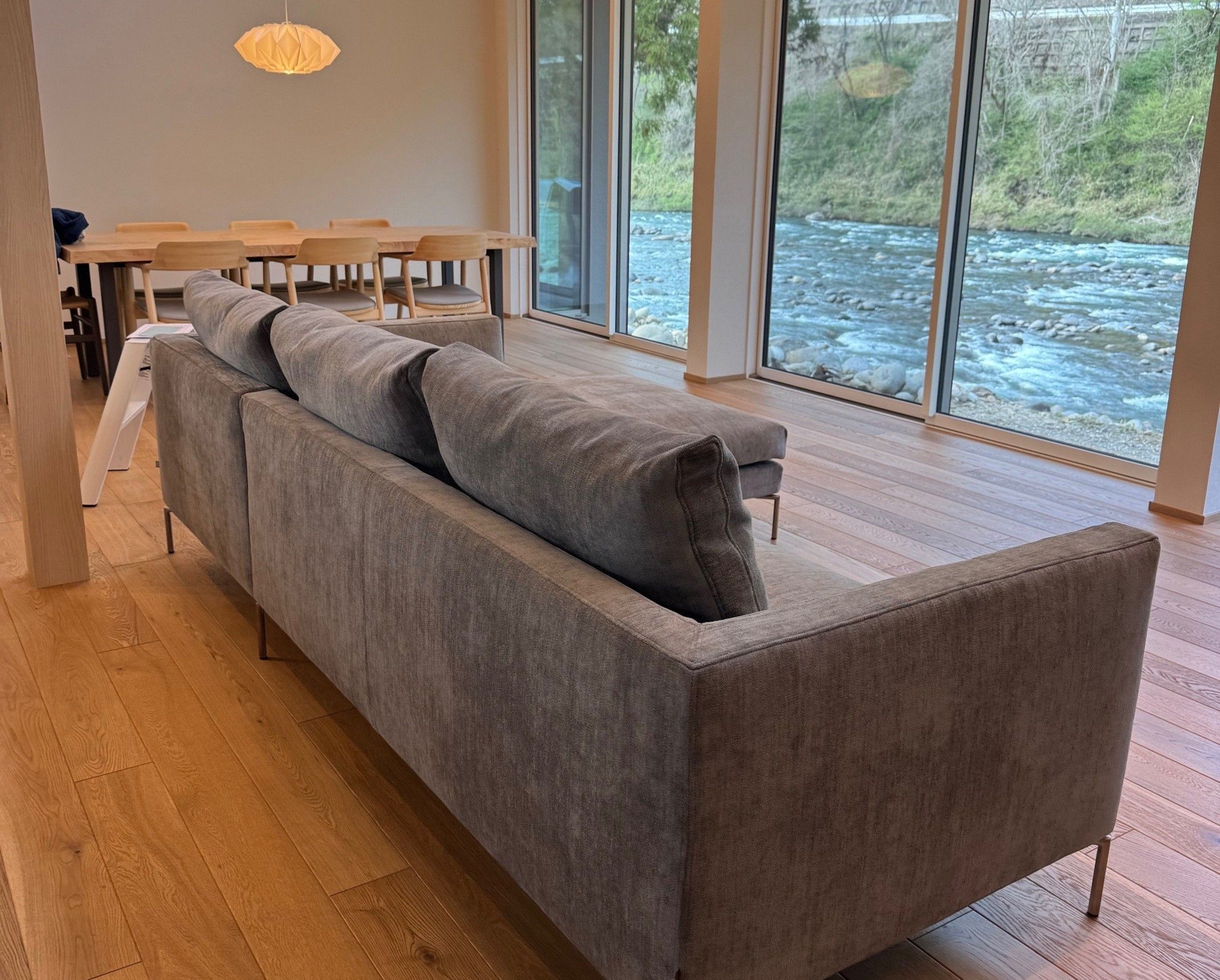 オーク材のフローリングでナチュラルな空間、窓の外は豊かな自然と川の流れの音。日本の和の空間にもアイラーセン社のソファは馴染みます。手触りの良いSOFTの生地。