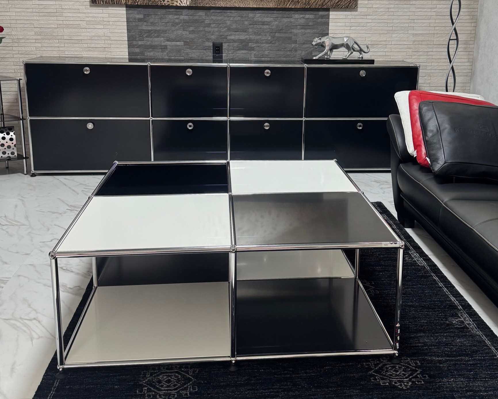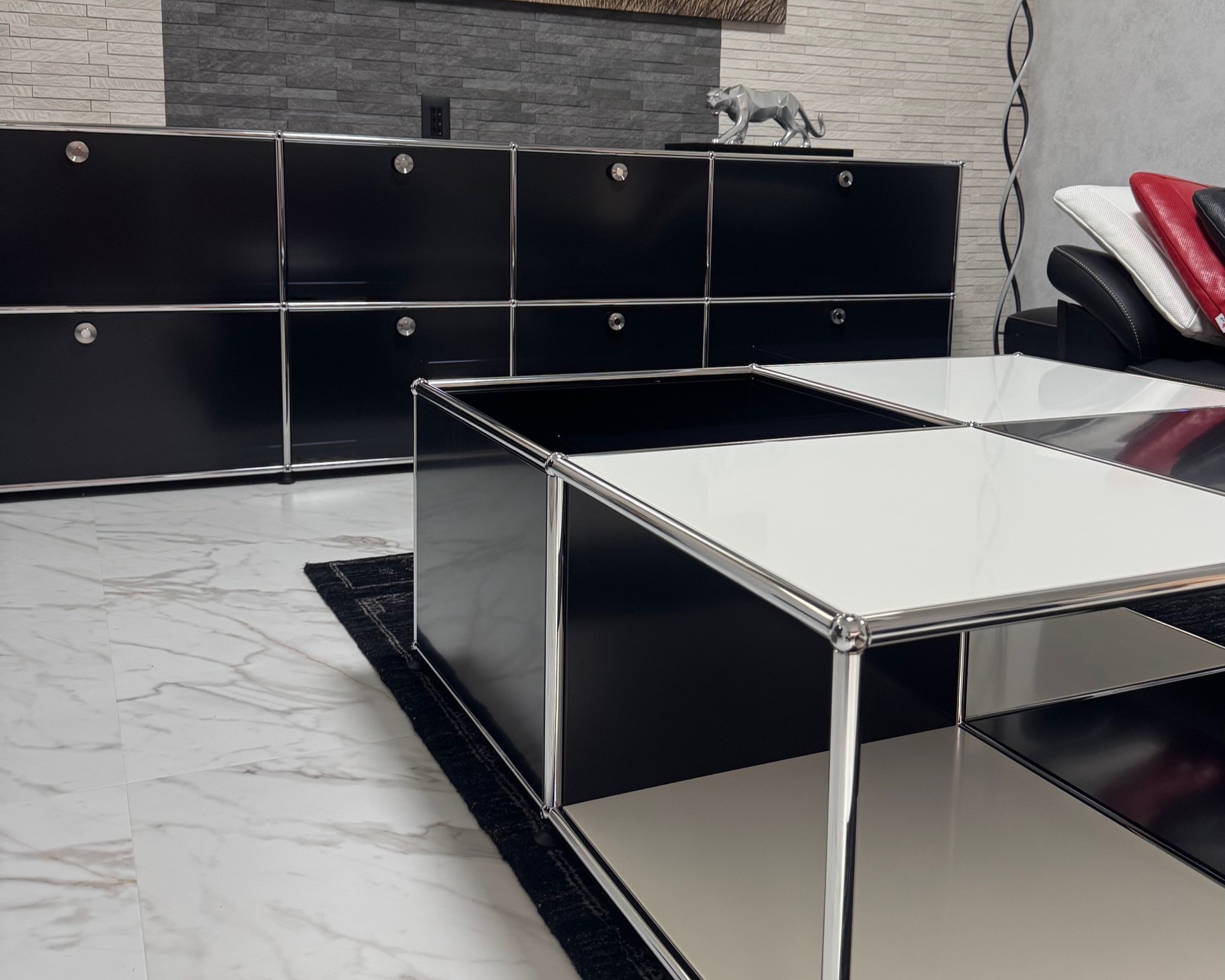 くつろぎ空間のリビングの奥に存在感のあるUSMのキャビネット。モノトーンで統一した空間でソファの前のリビングテーブルもUSMでカスタマイズしたリビングテーブル。