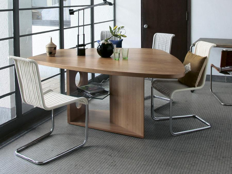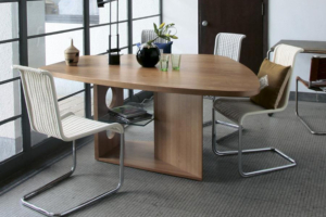 30年近く人気のロングセラー。座る人数が限定されない木の葉のような不定形な天板は、ゲストを招いたときには大人数で座れ、微妙な視線のズレが心理的圧迫感を逃がしてくれます。また視線を自然と集めては逸らせるという絶妙な効果を生みます。家族で過ごす時間もこのカタチが効力を発揮。向かい合わないことで程よい距離が生じ、子どもが宿題をしている横で仕事をしても、互いに邪魔になりません。変形天板ですが、一部分が直線なので、壁付けも可能です。
