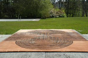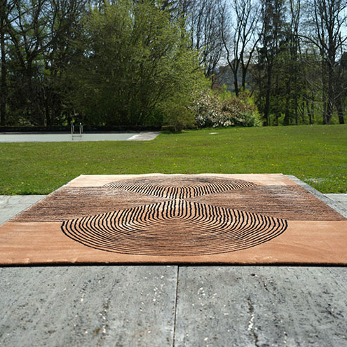 スイスのブランドFISCHBACHER(フィッシュバッハ)の「ISHILANG(イシラング)」は、海洋廃棄物のアップサイクルから生まれたリサイクルポリエステル糸を使用したハンドタフトカーペット。アフリカZULU族の盾をモチーフにしたデザインで、特徴的な楕円形のモチーフをカーペットで表現しています。